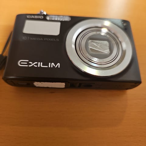 Casio Exilim kompaktkamera i svart farge. Kameraet er et digitalt kompaktkamera med innebygd zoomobjektiv og skjerm på baksiden for visning og menyvalg. Det følger med veske og lader/ladestasjon slik det vises på bildene. Egner seg til enkel fotografering på reise, hverdag og fritid.