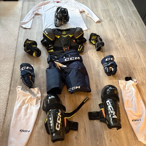 Selger 2 set med ishockey utstyr til barn. Det sorte sette er i størrelse youth medium og det røde sette youth large.