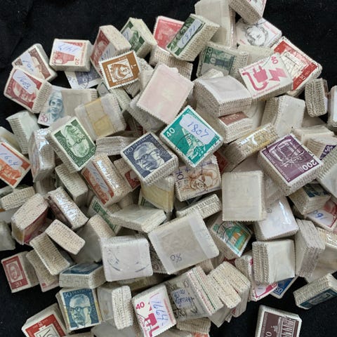 Samling med ulike klisjeer og trykkplater for grafisk trykk.