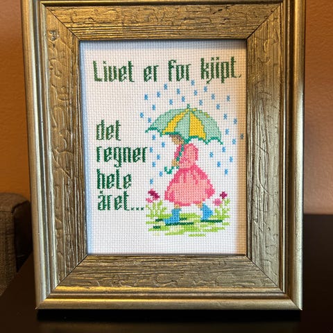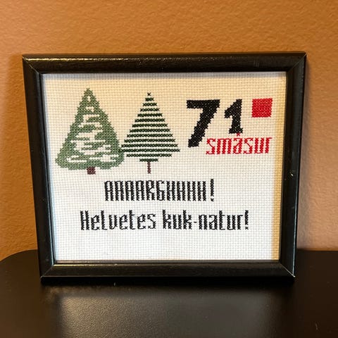 Geriljabroderi med sitat fra «71 grader nord - Norges tøffeste kjendis» 2025 - ferdig innrammet i ny ramme. Rammens utvendige mål er 22x17.