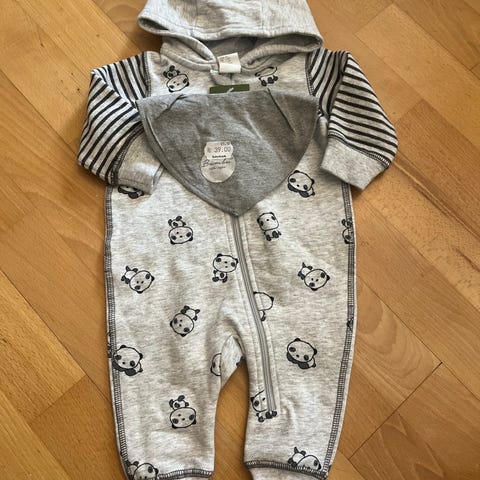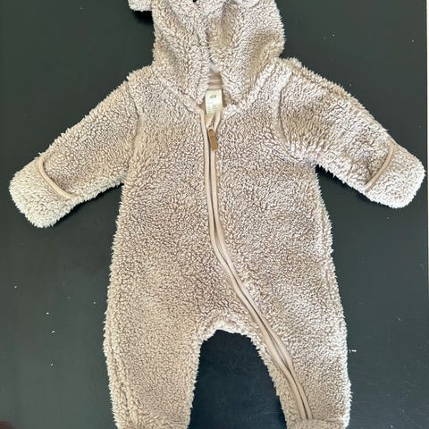 Selger helt ubrukt H&M bamsedress til baby i størrelse 56. Stor i størrelsen og kan passe opp til str. 68. Dressen er brun og laget i polyester med myk, pelsliknende stoff. Modellen har hette med små ører, lange ermer og lange ben. Glidelås foran gjør den enkel å ta av og på.