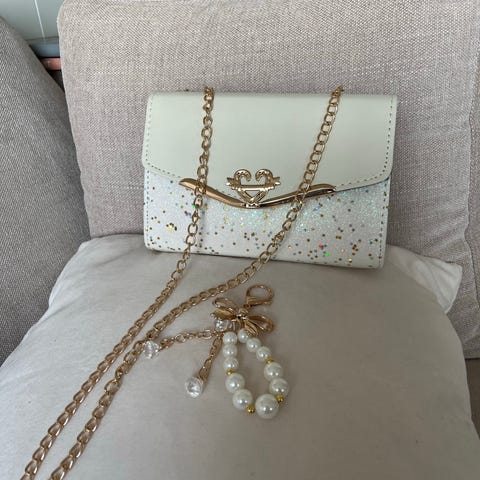 Selger denne kjempefine vesken i hvitt materiale og gull detaljer. Aldri brukt, helt ny.