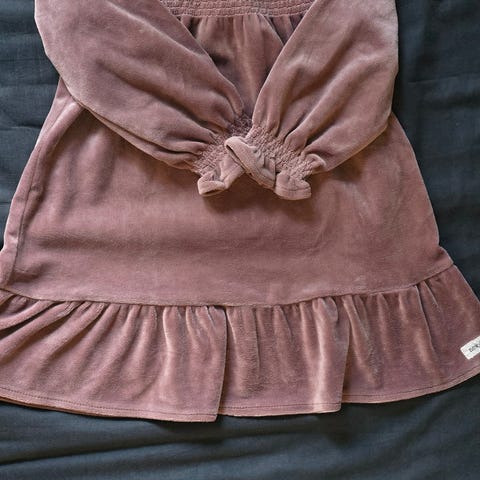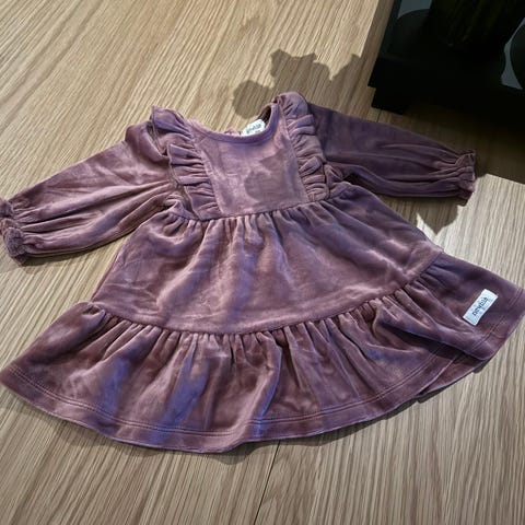 Newbie kjole for jente i størrelse 62. Kjolen er lilla og laget i polyester. Modellen har lange ermer, volangdetaljer og myk velurlignende overflate. Knapper bak ved nakken/ ryggen som du ser på bilde 2.