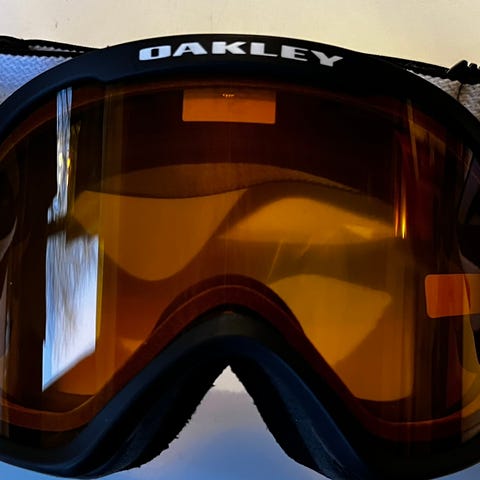 Oakley skibrille med oransje linse og svart ramme. Justerbar stropp med Oakley-logo på sidene. Leveres med oppbevaringspose og original eske, slik det fremgår av bildene. Egnet som skibrille eller snowboardbrille for voksne.