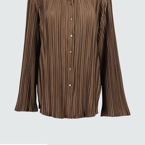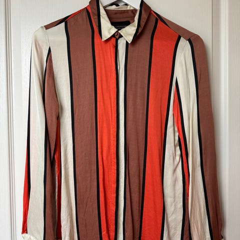 Amisu bluse for dame i størrelse S. Blusen er flerfarget med vertikale striper i blant annet røde, rosa, brune og lyse toner. Modellen har klassisk krage, lange ermer og knappelukking foran. Stoffet er lett og glatt, egnet til både hverdags- og kontorbruk, og kan brukes alene eller under jakke eller blazer.