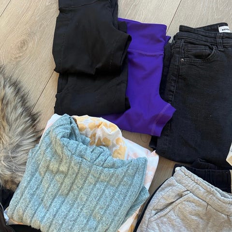 Pakken inneholder: 8 bukser, 8 gensere, 7 skjørt, 3 penkjoler, singleter, shorts, sportsset, fleeceklær, pusevest. Over 40 plagg. Pent brukt.