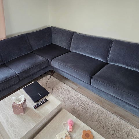 Selger en romslig og moderne hjørnesofa i svart kunstskinn. Sofaen er pent brukt og i god stand, uten skader eller løse sømmer. Den har god sittekomfort, solid konstruksjon og passer perfekt både i stue, TV‑krok eller kjellerstue.