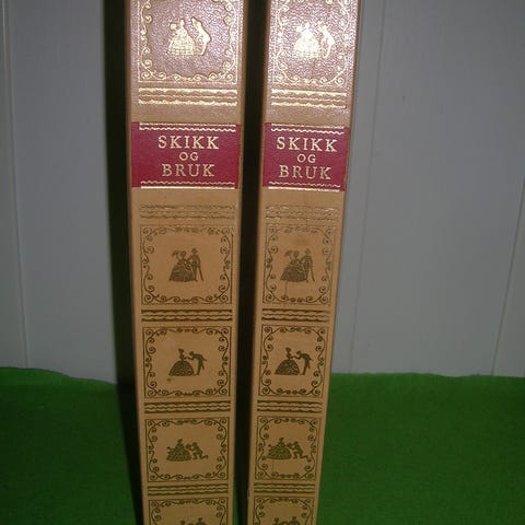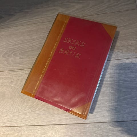 Skikk og bruk innbundet bok fra 1960-utgaven, utgitt av J. W. Cappelens Forlag, Oslo. Boken er trykt i boktrykk hos Reinset & Søn, Oslo. Teksten omhandler skikk og bruk, høflighet og sosialt samvær. Innbindingen er dekorert rygg i lyst skinn med preget mønster og tittel på rød ryggtittel, samt røde permer. Egner seg som oppslagsverk om etikette og som tidsdokument fra 1960-tallet. En skikkelig leca blokk av en bok, full av gode manerer og skikk&bruk fra en svunnen tid….