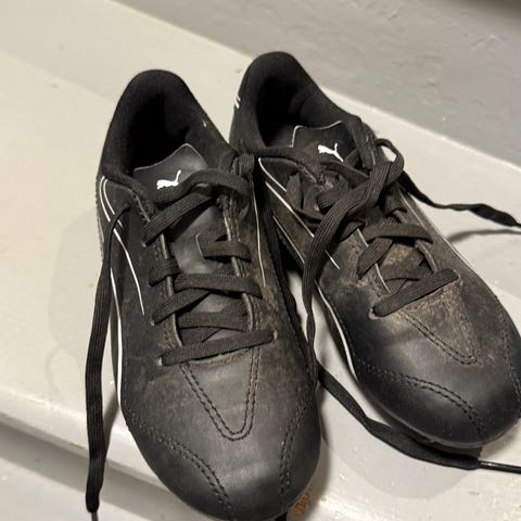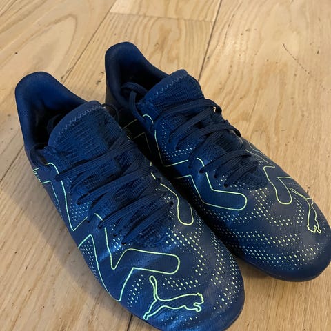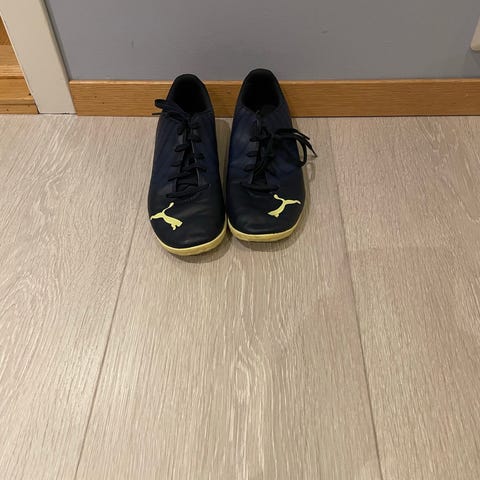 Puma fotballsko i størrelse 33 (EUR), tilsvarende ca. 20 cm innvendig lengde. Skoene er blå med gule detaljer og har lisser. Yttersålen er mønstret og egnet for spill på harde underlag, for eksempel kunstgress eller grus. Passer til barn som trenger lette fotballsko i denne størrelsen.