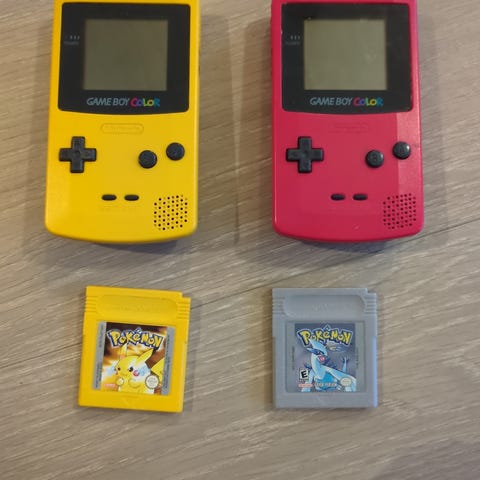 Selger en original Nintendo Game Boy Color i turkis/blå farge sammen med Pokémon Red (rød kassett).