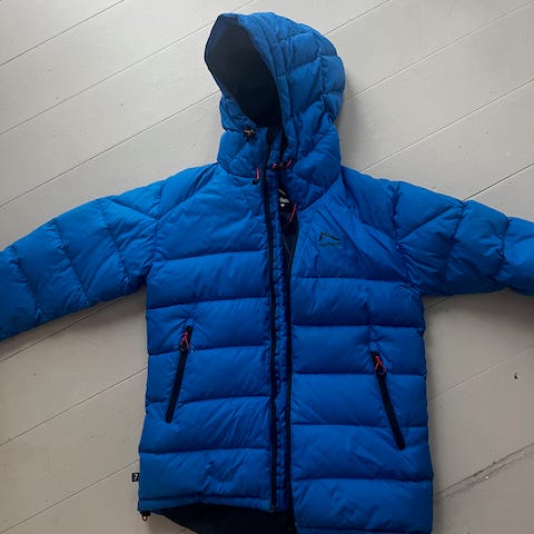 Praktisk Reima jakke størrelse 164. Modellen er vattert med horisontale sømmer og avtagbar hette og ermer.