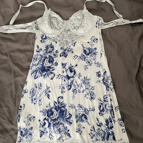 Victoria's Secret nattkjole for dame i størrelse S. Nattkjolen er flerfarget med blomstertrykk og har blonder øverst. Materiale er bomull. Tynne skulderstropper og kroppsnær passform, egnet som nattøy eller loungetøy.