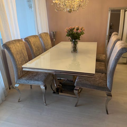 Selger et moderne og stilrent spisebord med glassplate, kjøpt på A‑Møbler (opprinnelig). Bordet kommer med 6 matchende, komfortable stoler i mykt, velur‑aktig stoff. Settet er brukt, men i god og velholdt stand.