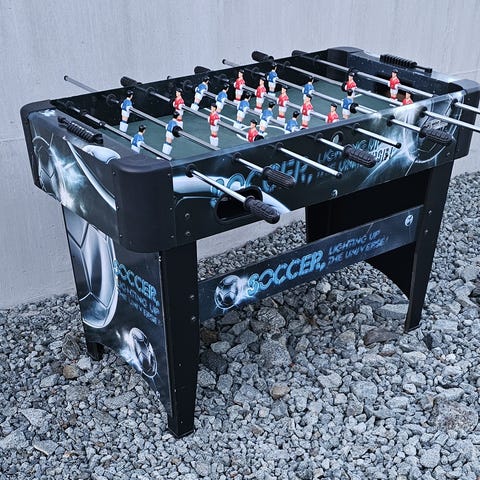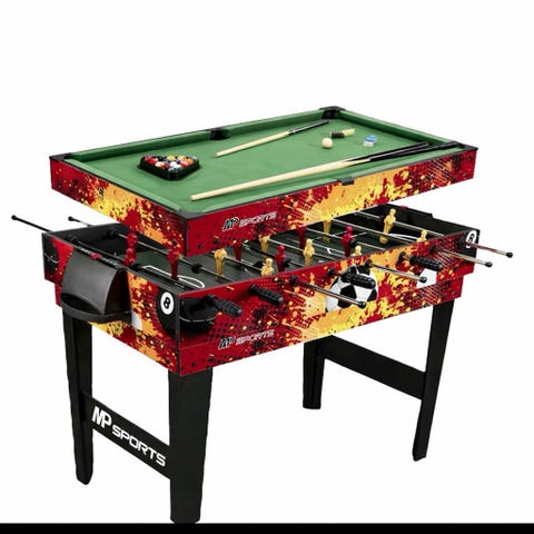 Et kombi spillbord med fussball, airhockey, bordtennis og biljard. Tilbehør til alle spill følger med.