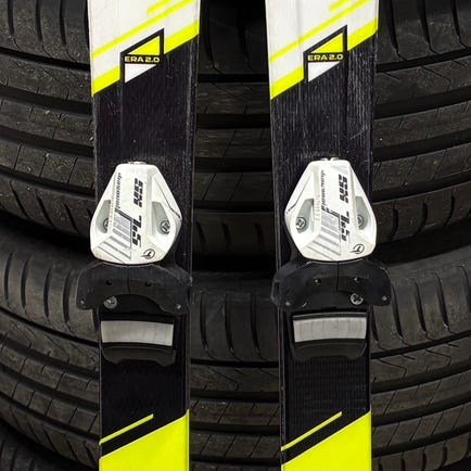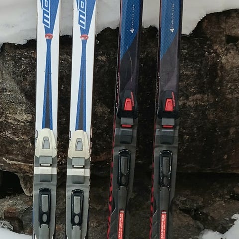 Selger fine alpinski fra Salomon. Sålene er fine og bindingene og skiene fremstår hele og pene.