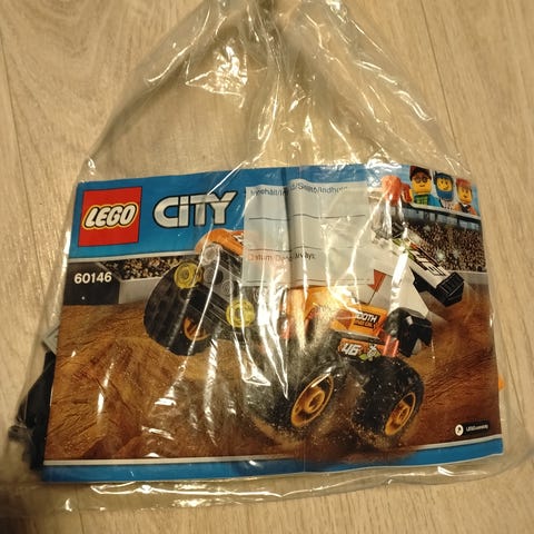 LEGO City lekesett med monstertruck og motorsykkel. Settet består av en stor terrengbil/monstertruck med store hjul og førerfigur, samt en mindre motorsykkel med fører. Delene er i hovedsak blå, oransje og svarte med ulike detaljer. Passer til bygging og lek med kjøretøy i LEGO City-universet.