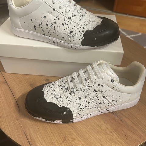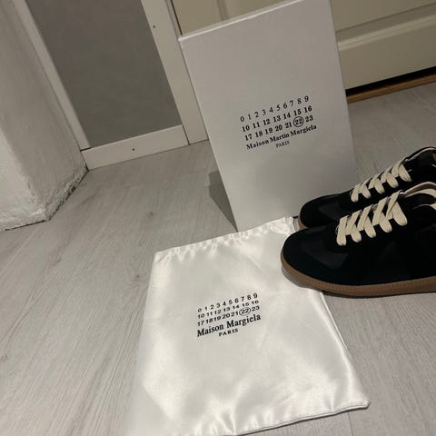 Maison Margiela gats sneakers i størrelse 43. Modellen har overdel i grått skinn og semsket skinn med lyse lisser og gummisåle i naturfarge. Klassisk joggesko-modell egnet til hverdagsbruk.