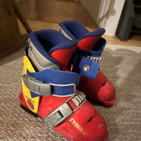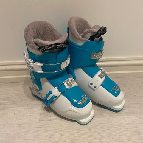Tecnica skistøvler for barn i størrelse 20,5. Skistøvlene har to spenner for justering og god støtte. Fargekombinasjon blå og hvit med grått innerfôr.