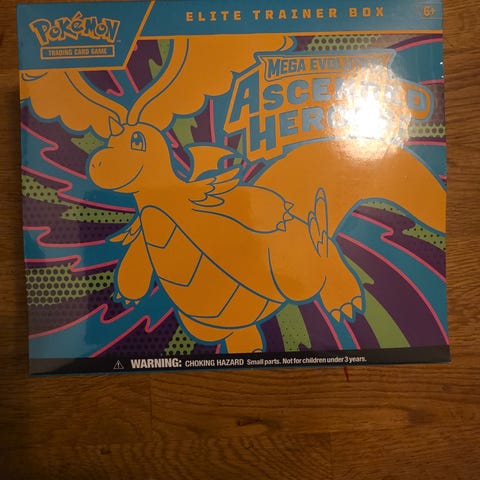 Boksen er en Elite Trainer Box fra Pokémon-serien «Mega Evolution Ascended Heroes». Den inneholder et utvalg samlekort og tilbehør til Pokémon Trading Card Game, typisk boosterpakk er, kortbeskyttere, terninger og markører, samt oppbevaringsboks med motiv. Egnet for samlere og spillere av Pokémon-kort som ønsker et temabasert sett med kort og spilltilbehør i én pakke.