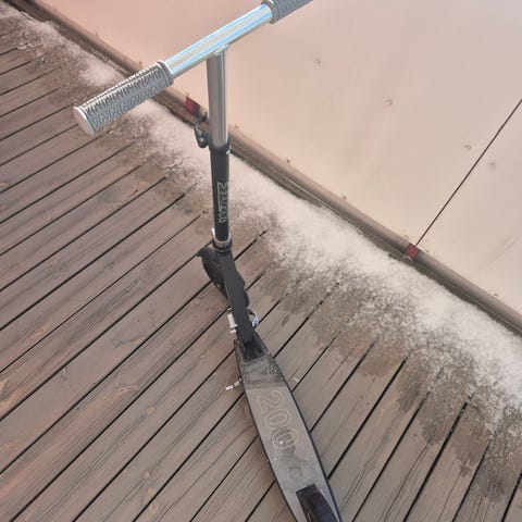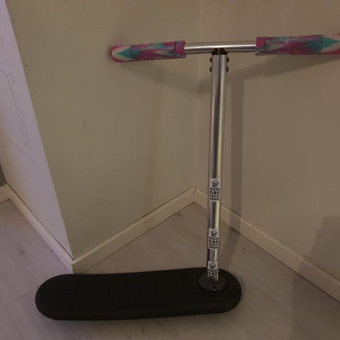 Indo sparkesykkel med solid ståbrett og rett styre i metall. Styret har svarte håndtak og er festet til et robust plastbrett. Perfekt til å øve på triks på trampolina. Kjøpt på skatepro.no.