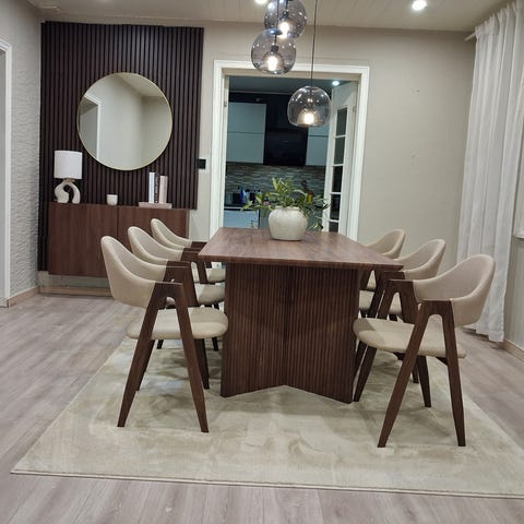 Stor flott spisestue med 6 velourstoler og 2 ekstra skiver