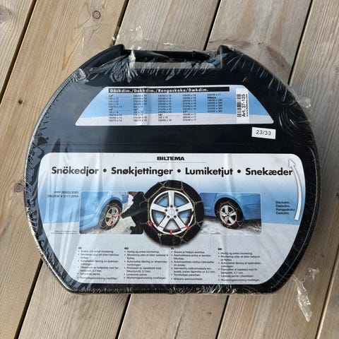 Biltema snøkjettinger til personbil. Leveres i plastkoffert. Kjettingene er beregnet for bruk på vinterføre for å gi bedre grep på snø og is. På esken finnes tabell som viser hvilke dekkdimensjoner kjettingene passer til. Egner seg til midlertidig bruk på snødekte og isete veier der kjetting er påkrevd eller anbefalt.