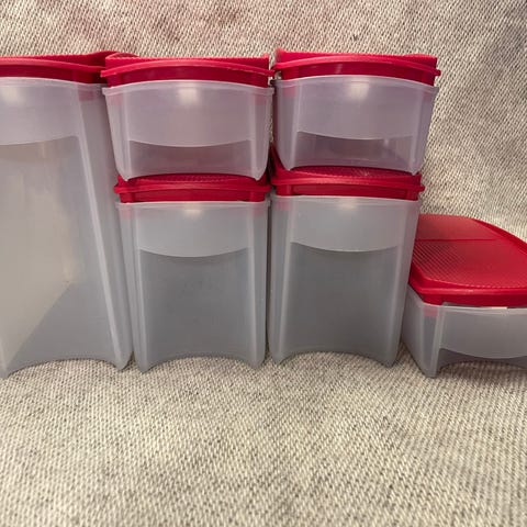 Sett med fem rektangulære beholdere i ulike størrelser, egnet til tørrvarer som mel, sukker, pasta, ris, kornblanding og lignende. Boksene er halvgjennomsiktige slik at innholdet er synlig, og har tette lokk i rød plast. Beholderne er formet slik at de kan stå tett inntil hverandre i skap eller på kjøkkenbenk. Plastmaterialet er lett og kan vaskes i maskin. Lett å åpne og lukke.