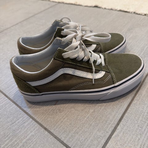 Vans Filmore Decon joggesko i størrelse 41. Modellen er lave sneakers med snøring. Skoene er i grønn farge med hvit sidestripe og hvit yttersåle. Overdelen er i tekstil/suede-lignende materiale med polstret kant rundt ankelen. Passer som hverdagssko og fritidssko.