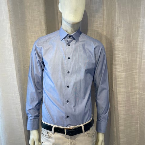 Leter du etter en skjorte som kombinerer klassisk eleganse med et moderne mønster? Jeg selger en meget pen Eton-skjorte i et detaljert, geometrisk mønster i blåtoner.