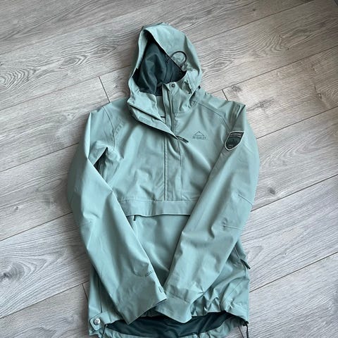 Dope Blizzard skiakke for dame i størrelse S. Jakken er grønn og laget med ytterstoff i polyester. Modellen er en anorakk med fast hette og snøring. Den har stor kengurulomme med klaff og Dope-logo på brystet, samt glidelås under armene. Vinterjakken er egnet til alpint/ski og til andre utendørsaktiviteter.