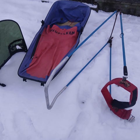 Nordic cab med ski og hjul. Drag til både mennesker og hund. Samt sele brukt til samojed. Det er mye utstyr å få kjøpt til den. Denne har vært lagret inne, og vært i bruk kun 2 ganger. Så den er som ny. Kan leveres/hentes mellom Minnesund og Kløfta.