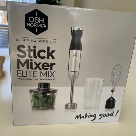 OBH Nordica stavmikser med visp og hakker i svart utførelse. Settet består av motorenhet med ledning, ballongvisp og kniv med transparent beholder på ca. 5-600 ml og lokk. Hakkebollen har avtakbar knivinnsats i metall. Egnet til enklere miksing, visping og hakking av ingredienser på kjøkkenet.