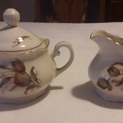 Flotte porselenmugger, kaffi/te kanne, 2 små kopper med tefat , liten skål og liten fløtemugge