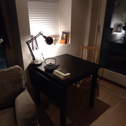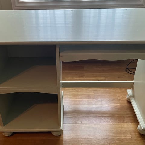 Skrivepulten er hjørne med fastmontert hylle på siden. Hylla er 110 cm høy og 54 cm bred. Pulten har også hylle under plata og på kort siden.