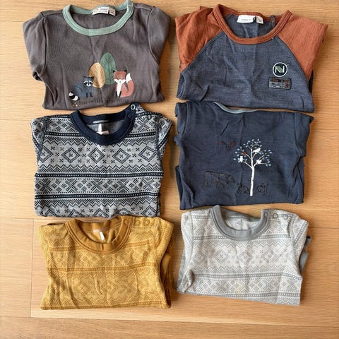 Sett med tre langermede ullbodyer fra Hust & Claire og en ullbody fra Name It i størrelse 68. Det kan være små hull eller misfarging på dem, da de er brukt, men jeg så ikke noe da jeg gikk over dem.