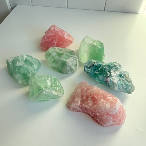 Grønn dekorstein i krystallformet design. Steinens overflate har flere spisse topper og fasetter som gir et glitrende uttrykk når lyset treffer. Passer som dekorasjon i hjemmet, i samlinger, på alter eller som blikkfang på hylle eller skrivebord.