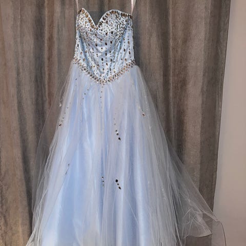 Pent brukt ballkjole med unike detaljer nedover skjørtet. Kjøpte den brukt så er nok brukt noen ganger før meg, men jeg har kun brukt den en gang. Korsett på baksiden så størrelsen er litt fleksibel. Veldig fin lys turkis farge. Kan komme å prøve.