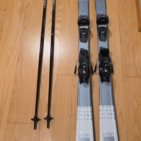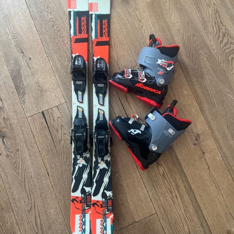 Völkl alpinski med lengde 155 cm. Skiene har fargerikt mønster på oversiden og svart underdel. Monterte alpinstøvler og bindinger følger med på bildene, alpinstøvelene er Dalbello Aerro 55. Skiene er egnet til alpinkjøring i bakke. Passer for brukere som trenger ski i lengde rundt 155 cm. Skiene har markerte monteringssoner for bindinger. Støvler er brukt en del men er helt fine unntatt litt slitt på bunn. De er i størrelse 33,9cm.(str 49 i vanlig størrelse) Skiene ser bra ut(er ikke en skiperson så vet lite om det) usikker på hvor mye det er verdt så gjerne kom med bud er fleksibel