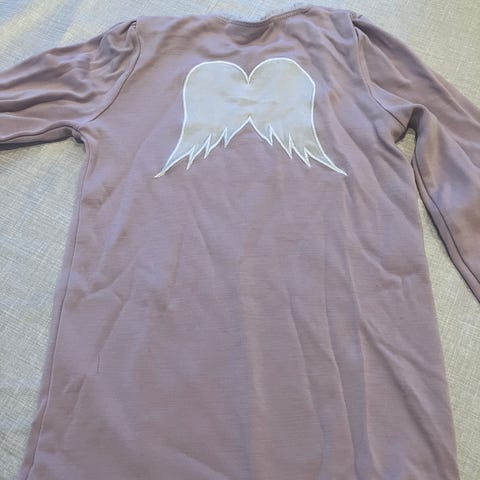 WoolLand ullgenser for jente i størrelse 98 (merket 98–104). Kjolen er laget i myk merinoull og har lang erm. Fargen er rosa, med hvite blondekanter og applikerte hvite englevinger på ryggen. Passer godt som hverdagsplagg eller som innerste lag på kjølige dager. Det kan forekomme noe bruksspor, se bilder for detaljer.