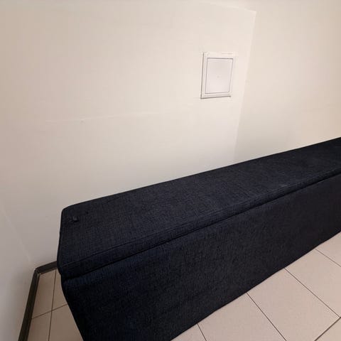 Den er ca. 7 år gammel og i god stand. Mørk, tidløs tekstil som passer inn i de fleste interiører. Lokket åpnes lett og holder seg oppe, og det er god plass til puter, pledd eller annet du vil lagre.
