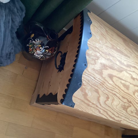 Kiste til oppbevaring, pynt og sitte på.