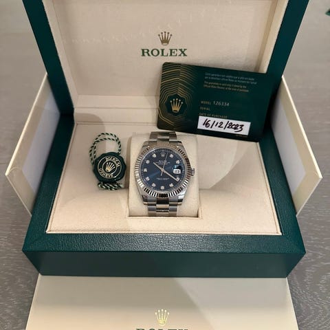 Klokken er lite brukt, kjøpt ny i Norge i 2023, og fremstår som meget pen. Dette er 36 mm-modellen (ref. 126000) med den populære turkise skiven som virkelig skiller seg ut - en moderne klassiker som er vanskelig å få tak i hos forhandler.