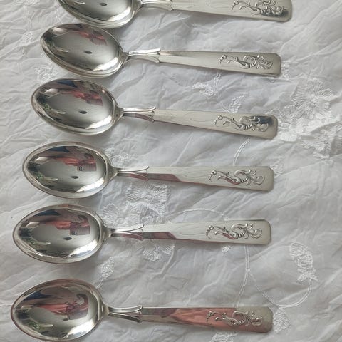 3 et vakkert blomstermønster og ordene «ny sølv» skrevet på baksiden.