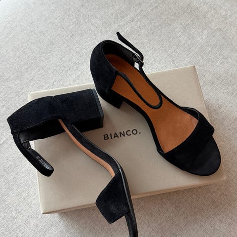 Kjempefine svarte lave sling backs/høye hæler, med sløyfe med små diamanter. Er litt strikk i stroppen bak hælen som gir en komfortabel passform for ulike føtter! Nypris 999, utsolgt i størrelsen på nett nå. Hæl 6cm, med puter i skoen som gjør skoen behagelig å gå med