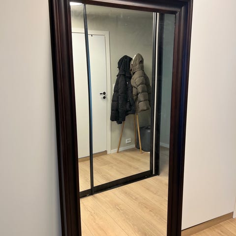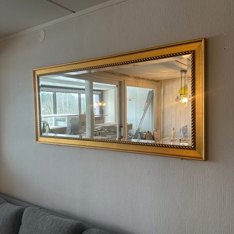 Stort IKEA Levanger speil med gulltoner. Profilert speilglass. Har noen bruksmerker på de to nederste hjørnene, men ikke noe man legger merke til.