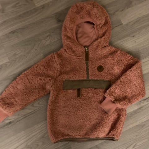 Selger denne koselige teddyfleecen fra Bruse. Varm, god og elastisk. Glidelåslomme foran til små skatter.