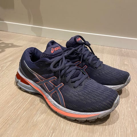 Skoene har blå overdel med rosa detaljer og snøring foran. Yttersålen har mønster som gir godt grep ved løping på hardt underlag. Overdelen er i pustende tekstilmateriale med syntetiske forsterkninger.