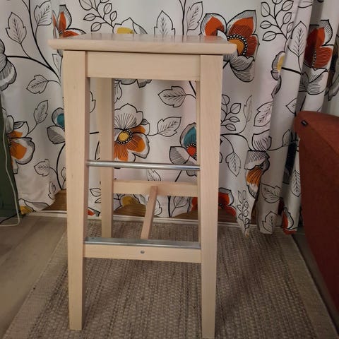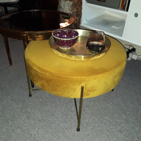 Hel og fin pall. Mål ca ø60/ h40. Nydelig sennepfarge og messing. Har vært brukt til "bord" avbildet brett og pynt følger ikke med. Hentepris 300,- reserverer ikke!