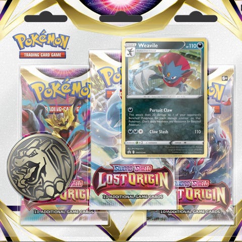 Selger uåpnet Pokemon Lost Origin 3-pack blistere. Disse kommer i to varianter, med Regigigas og Weavile som promo kort.