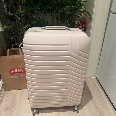 Stor rosa koffert i slitesterk polypropylen selges rimelig, veldig lite brukt.